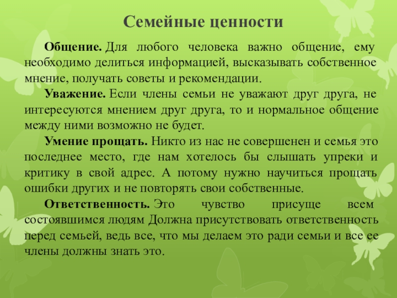 Уважение. Если члены семьи не уважают друг друга, не интересуются мнением друг друга, то и нормальное общение между ними возможно не будет.