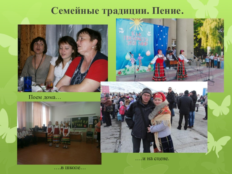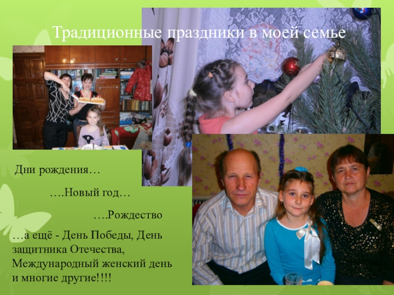 Традиционными праздниками в моей семье являются дни рождения, Новый год, Рождество, День Победы, День защитника Отечества, международный женский день. Среди семейных традиций выделяется пение и кулинария.