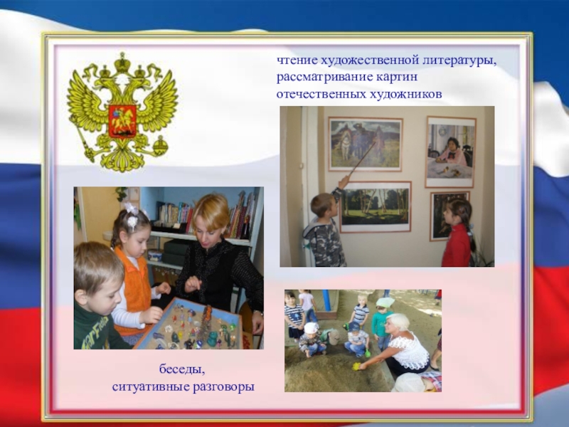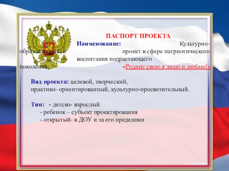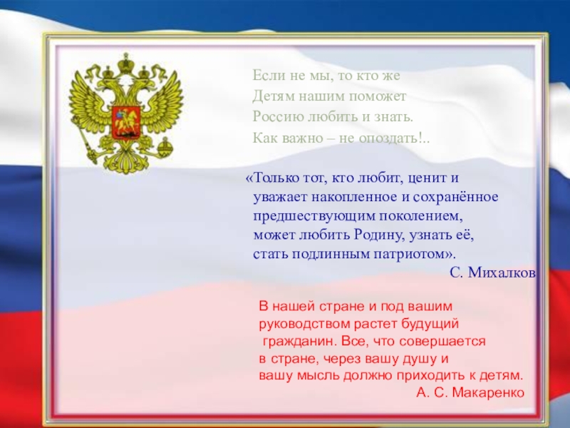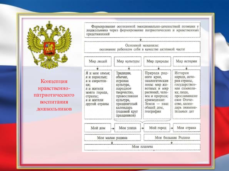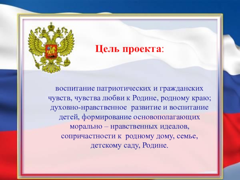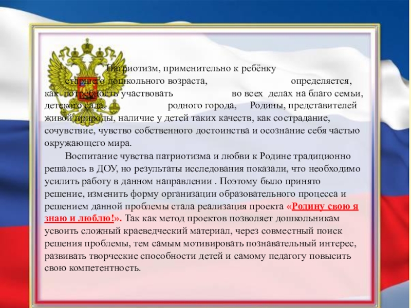 Патриотизм — любовь к Родине, преданность ей, ответственность и гордость за нее, желание трудиться на ее благо, беречь и умножать ее богатство – начинает формироваться уже в дошкольном возрасте. Невозможно воспитать чувство собственного достоинства, уверенность в себе, следовательно, полноценную личность, без уважения к истории и культуре своего Отечества, к его государственной символике. / «Концепция патриотического воспитания граждан РФ».