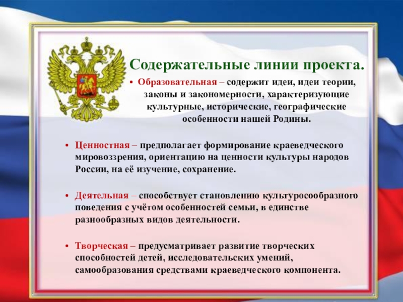 Ценностная – предполагает формирование краеведческого мировоззрения, ориентацию на ценности культуры народов России, на её изучение, сохранение.