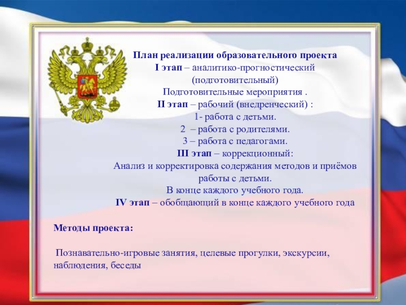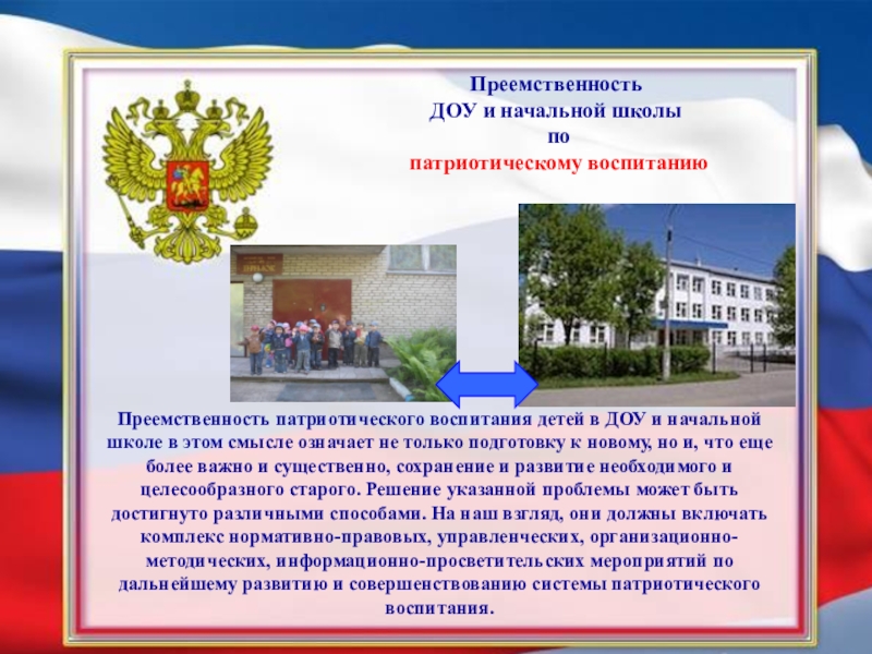 в ДОУ и начальной школе в этом смысле означает не только подготовку к новому, но и, что еще более важно и существенно, сохранение и развитие необходимого и целесообразного старого. Решение указанной проблемы может быть достигнуто различными способами. На наш взгляд, они должны включать комплекс нормативно-правовых, управленческих, организационно-методических, информационно-просветительских мероприятий по дальнейшему развитию и совершенствованию системы патриотического воспитания.