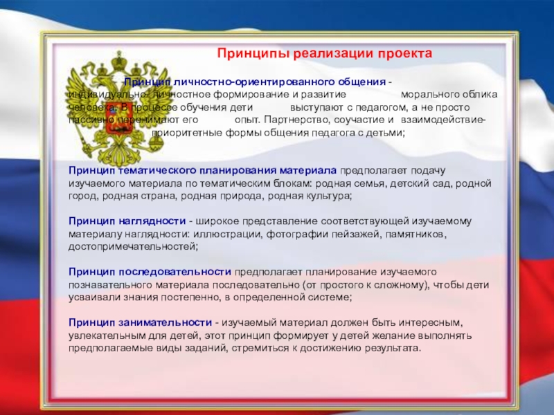 Принцип наглядности - широкое представление соответствующей изучаемому материалу наглядности: иллюстрации, фотографии пейзажей, памятников, достопримечательностей;