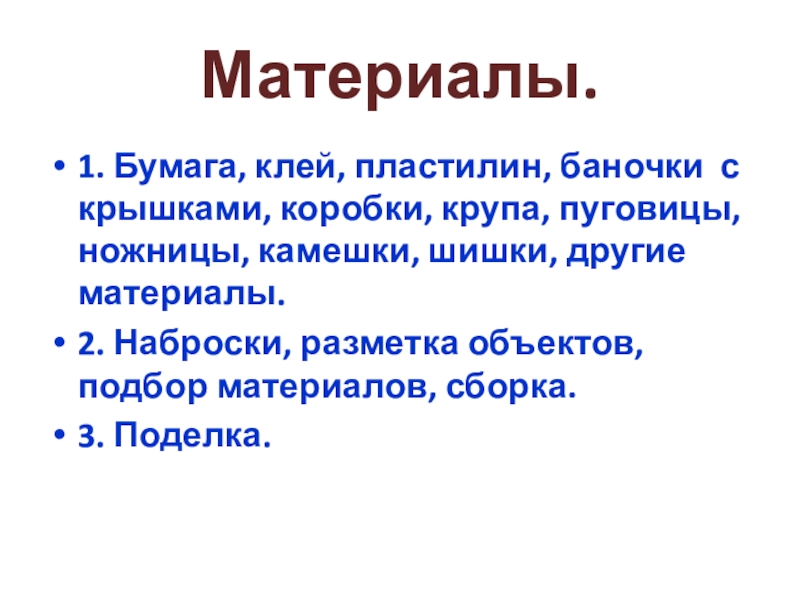 Материалы.1. Бумага, клей, пластилин, баночки с крышками, коробки, крупа, пуговицы, ножницы, камешки, шишки, другие материалы.2. Наброски, разметка