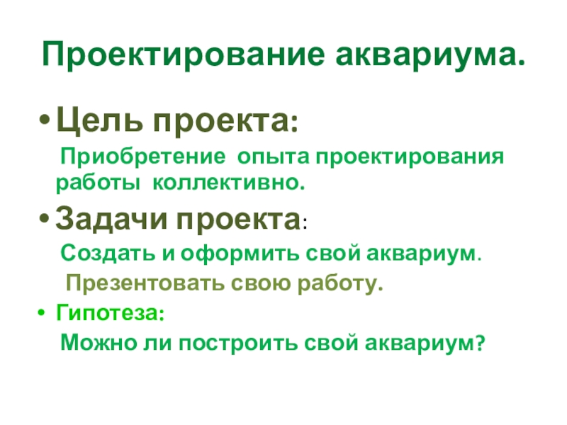 Проектирование аквариума.Цель проекта:   Приобретение опыта проектирования работы коллективно.Задачи проекта:   Создать и оформить свой
