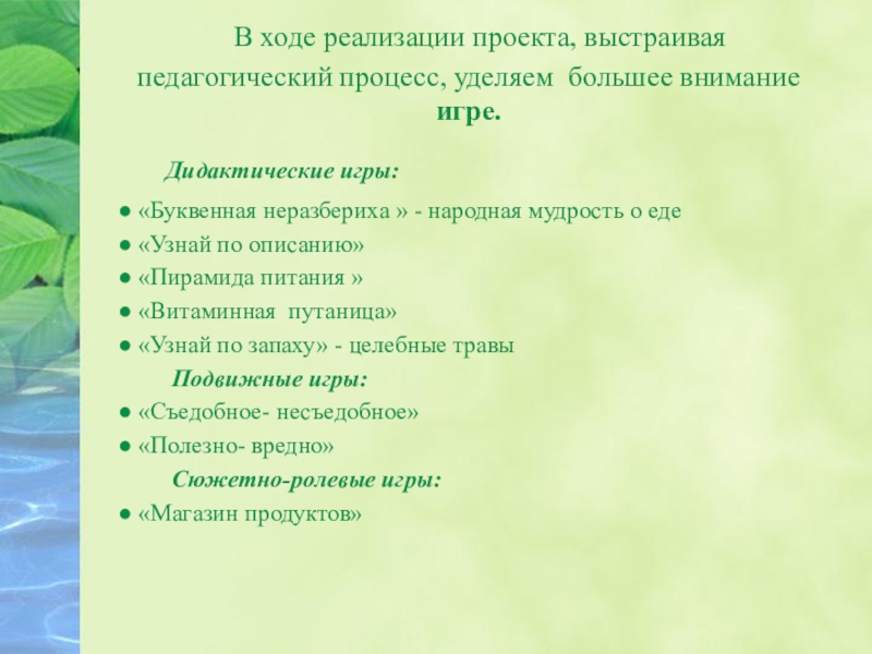 Слайд 13 В ходе реализации проекта, выстраивая педагогический процесс, уделяем большее внимание