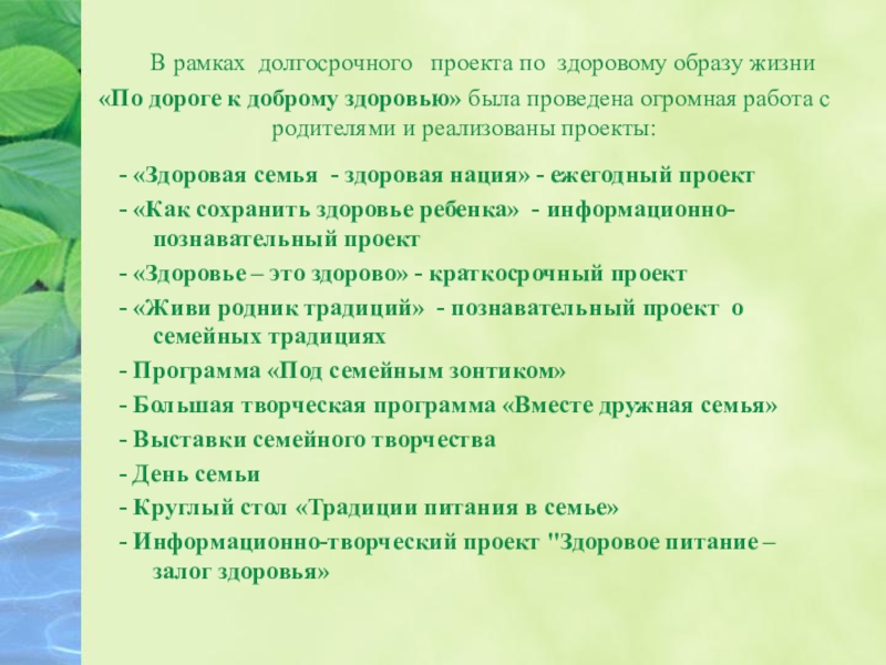 «По дороге к доброму здоровью» была проведена огромная работа с родителями и реализованы проекты: