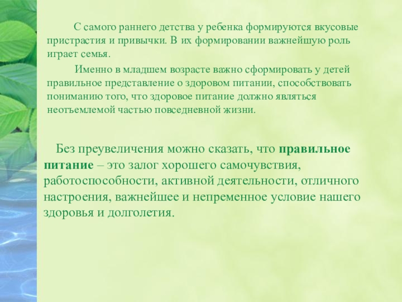 Именно в младшем возрасте важно сформировать у детей правильное представление о здоровом питании, способствовать пониманию того, что здоровое питание должно являться неотъемлемой частью повседневной жизни.