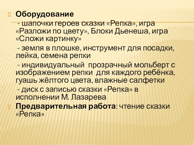Оборудование   - шапочки героев сказки «Репка», игра «Разложи по цвету», Блоки Дьенеша, игра «Сложи картинку»