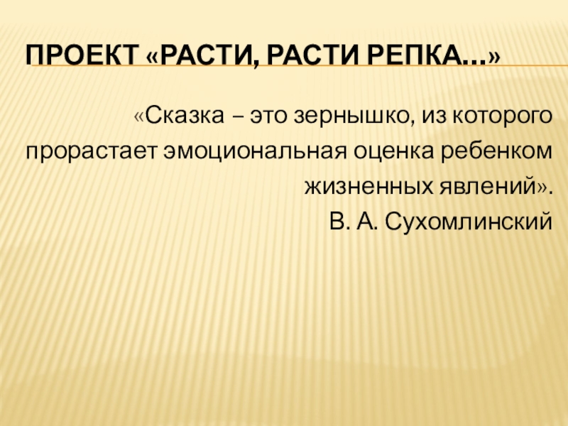 Проект «Расти, расти репка…»«Сказка – это зернышко, из которогопрорастает эмоциональная оценка ребенкомжизненных явлений».В. А. Сухомлинский