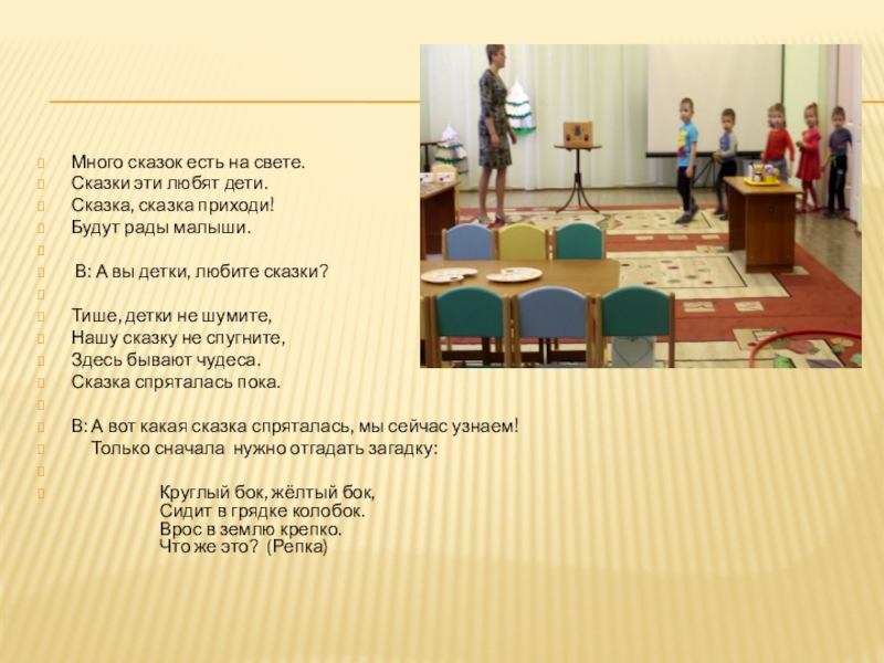 Много сказок есть на свете.Сказки эти любят дети.Сказка, сказка приходи!Будут рады малыши.  В: А вы детки, любите