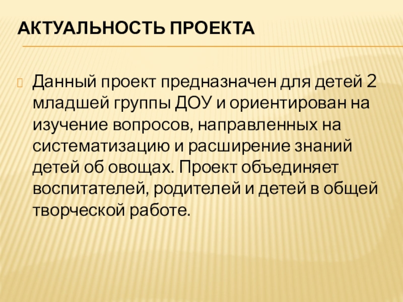 ориентирован на изучение вопросов, направленных на систематизацию и расширение знаний детей об овощах. Проект объединяет воспитателей, родителей и детей в общей творческой работе.