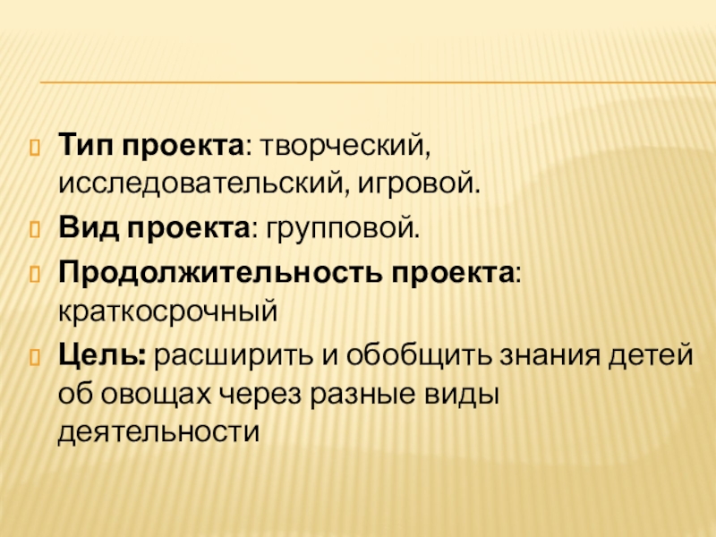 Тип проекта: творческий, исследовательский, игровой.Вид проекта: групповой.Продолжительность проекта:  краткосрочныйЦель: расширить и обобщить знания детей об овощах через