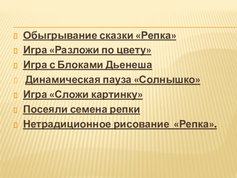 Обыгрывание сказки «Репка»Игра «Разложи по цвету»Игра с Блоками Дьенеша Динамическая пауза «Солнышко»Игра «Сложи картинку»Посеяли семена репкиНетрадиционное