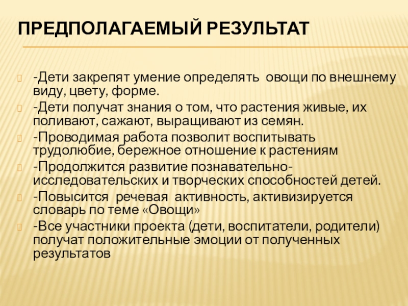 Предполагаемый результат -Дети закрепят умение определять овощи по внешнему виду, цвету, форме.-Дети получат знания о том, что