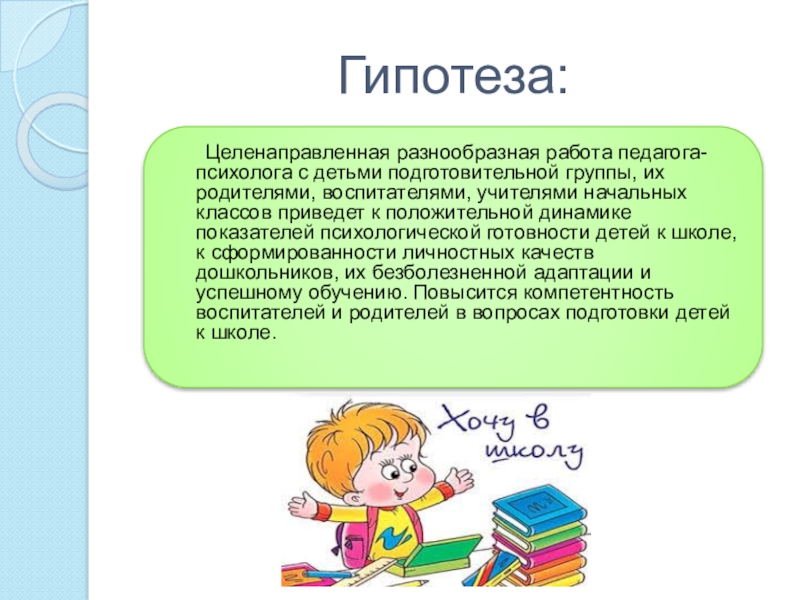 Гипотеза:   Целенаправленная разнообразная работа педагога- психолога с детьми подготовительной группы, их родителями, воспитателями, учителями начальных