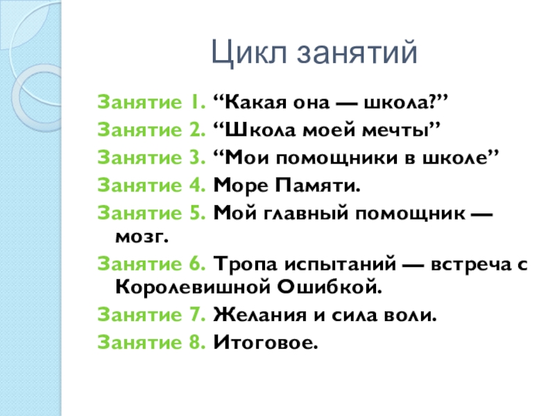 Цикл занятий Занятие 1. “Какая она — школа?”Занятие 2. “Школа моей мечты”Занятие 3. “Мои помощники в школе”Занятие