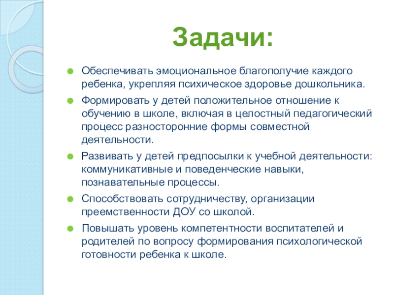 Задачи:Обеспечивать эмоциональное благополучие каждого ребенка, укрепляя психическое здоровье дошкольника.Формировать у детей положительное отношение к обучению в школе,