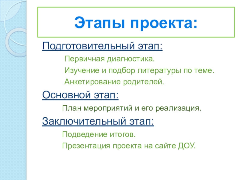Этапы проекта:Подготовительный этап:     Первичная диагностика.     Изучение и подбор литературы