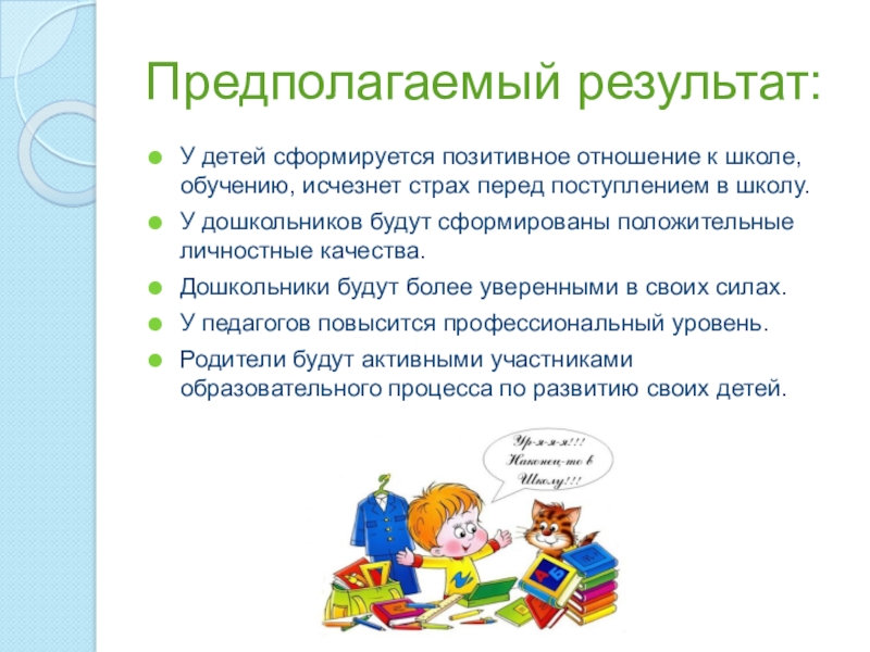 Предполагаемый результат:У детей сформируется позитивное отношение к школе, обучению, исчезнет страх перед поступлением в школу.У дошкольников будут