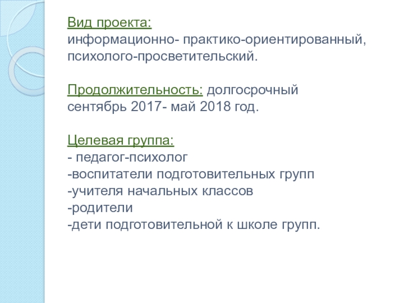 Слайд 2Вид проекта: информационно- практико-ориентированный, психолого-просветительский. Продолжительность: долгосрочный сентябрь 2017- май 2018 год. Целевая
