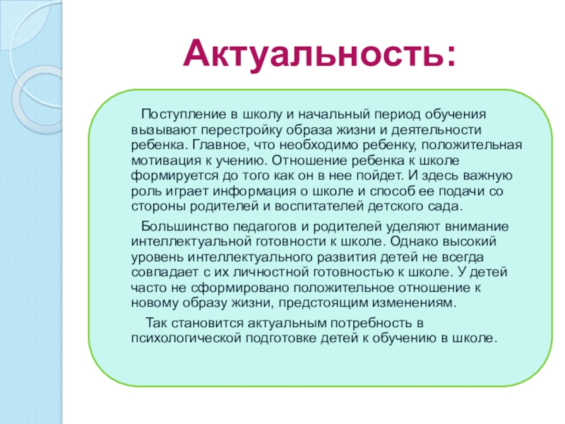 Большинство педагогов и родителей уделяют внимание интеллектуальной готовности к школе. Однако высокий уровень интеллектуального развития детей не всегда совпадает с их личностной готовностью к школе. У детей часто не сформировано положительное отношение к новому образу жизни, предстоящим изменениям.