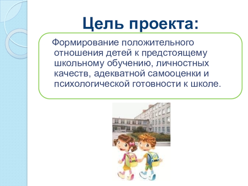 Цель проекта: Формирование положительного отношения детей к предстоящему школьному обучению, личностных качеств, адекватной самооценки и психологической готовности