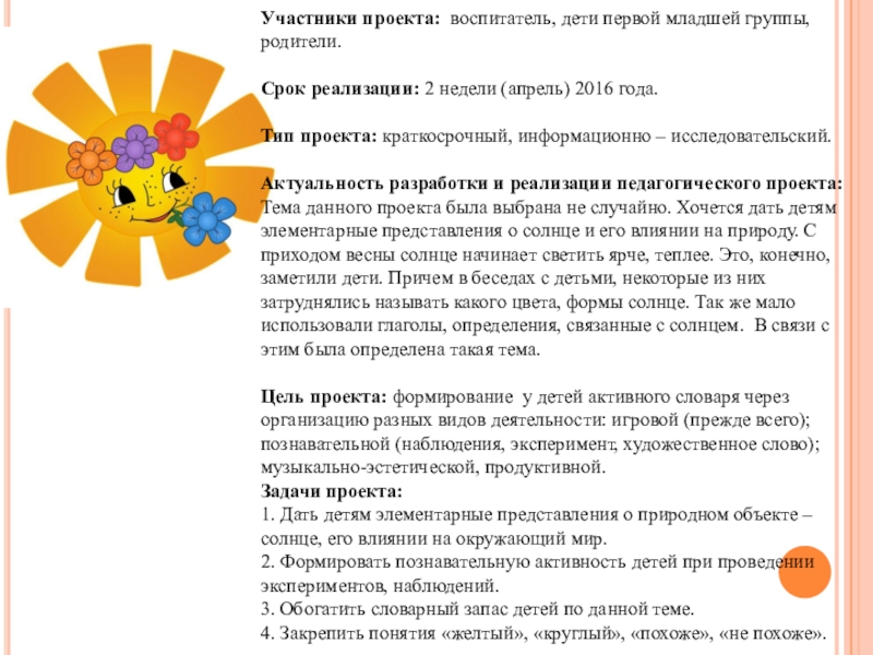 Тема данного проекта была выбрана не случайно. Хочется дать детям элементарные представления о солнце и его влиянии на природу. С приходом весны солнце начинает светить ярче, теплее. Это, конечно, заметили дети. Причем в беседах с детьми, некоторые из них затруднялись называть какого цвета, формы солнце. Так же мало использовали глаголы, определения, связанные с солнцем. В связи с этим была определена такая тема.