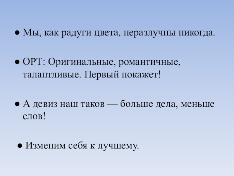 Это сайт презентаций, где можно хранить и обмениваться своими презентациями, докладами, проектами, шаблонами в формате PowerPoint с другими пользователями. Мы помогаем школьникам, студентам, учителям, преподавателям хранить и обмениваться учебными материалами.