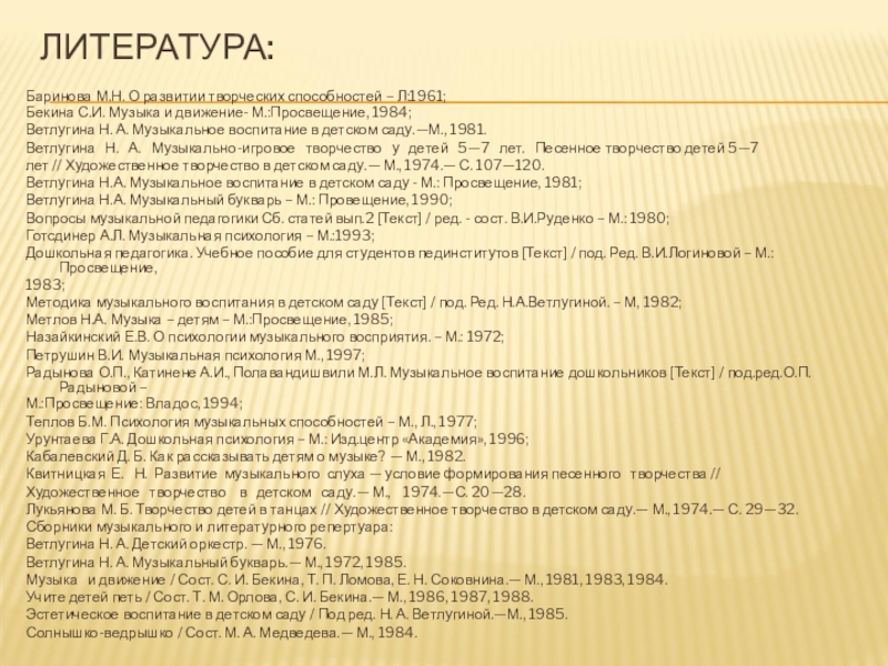 Ветлугина Н. А. Музыкальное воспитание в детском саду.—М., 1981.