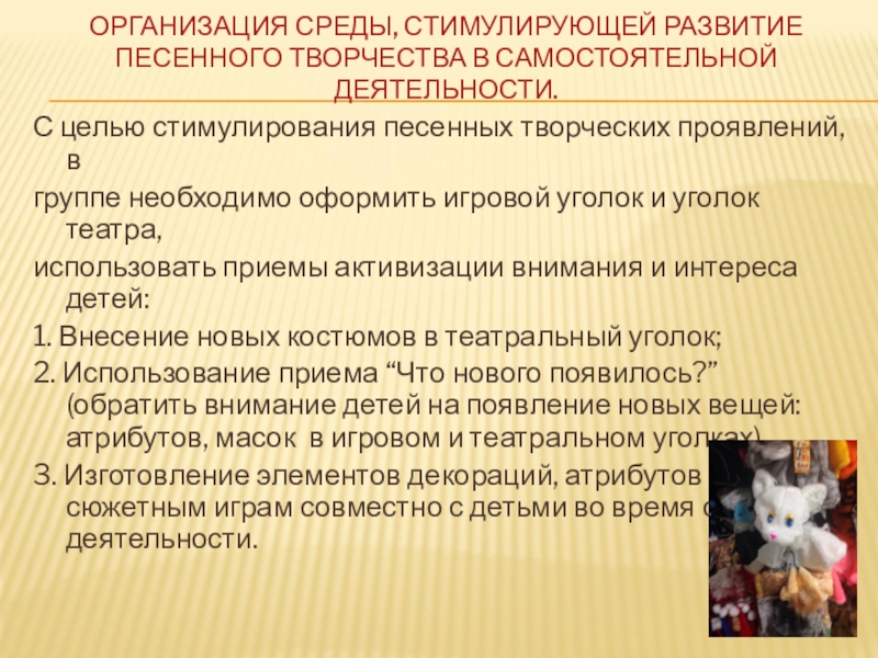 Слайд 14ОРГАНИЗАЦИЯ СРЕДЫ, СТИМУЛИРУЮЩЕЙ РАЗВИТИЕ ПЕСЕННОГО ТВОРЧЕСТВА В САМОСТОЯТЕЛЬНОЙ ДЕЯТЕЛЬНОСТИ.