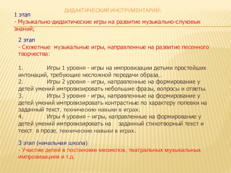 НА ЭТОМ ЭТАПЕ НЕОБХОДИМО СОРИЕНТИРОВАТЬ РЕБЕНКА В НОВЫХ ДЛЯ НЕГО ПРЕДНАМЕРЕННЫХ ТВОРЧЕСКИХ ДЕЙСТВИЯХ, В КОТОРЫХ БЫ ОН ПРИ ПЕРЕДАЧЕ ОБРАЗА ПЕРСОНАЖА ПОЛЬЗОВАЛСЯ НЕ ГОТОВЫМИ ПЕСНЯМИ, СОЧИНЕННЫМИ ПРОФЕССИОНАЛЬНЫМИ КОМПОЗИТОРАМИ, А ОЗВУЧИВАЛ БЫ ГЕРОЯ САМ, ТВОРЧЕСКИ ИМПРОВИЗИРУЯ ДЛЯ НЕГО ХАРАКТЕРНУЮ ПЕСЕНКУ.