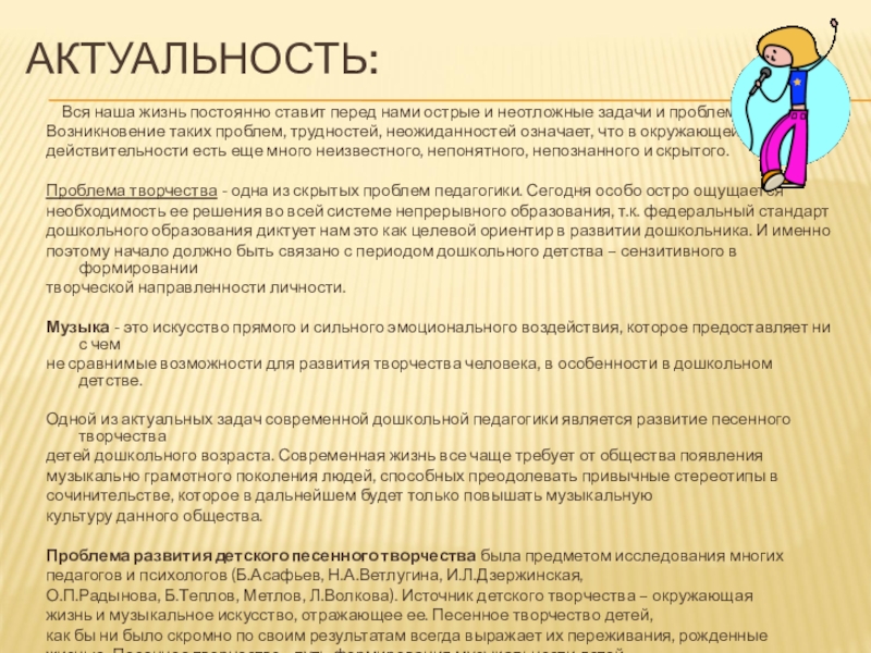 Одной из актуальных задач современной дошкольной педагогики является развитие песенного творчества