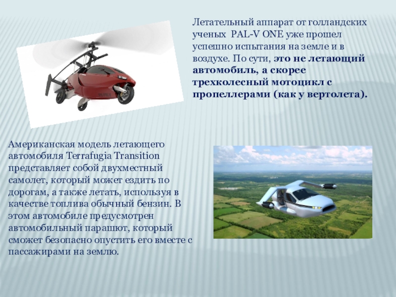 Американская модель летающего автомобиля Terrafugia Transition представляет собой двухместный самолет, который может ездить по дорогам, а также летать, используя в качестве топлива обычный бензин. В этом автомобиле предусмотрен автомобильный парашют, который сможет безопасно опустить его вместе с пассажирами на землю.