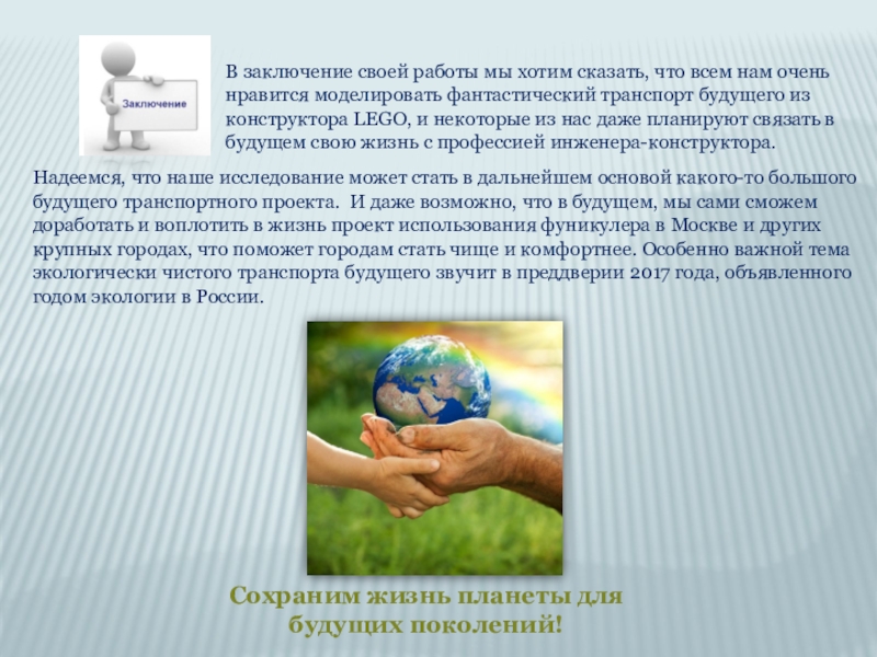 В заключение своей работы мы хотим сказать, что всем нам очень нравится моделировать фантастический транспорт будущего из конструктора LEGO, и некоторые из нас даже планируют связать в будущем свою жизнь с профессией инженера-конструктора.
