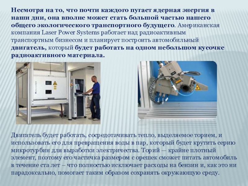 Двигатель будет работать, сосредотачивать тепло, выделяемое торием, и использовать его для превращения воды в пар, который будет крутить серию микротурбин для выработки электричества. Торий — крайне плотный элемент, поэтому его частичка размером с орешек сможет питать автомобиль в течение ста лет – что полностью исключает расходы на бензин и, как это ни парадоксально, помогает таким образом сохранять окружающую среду.