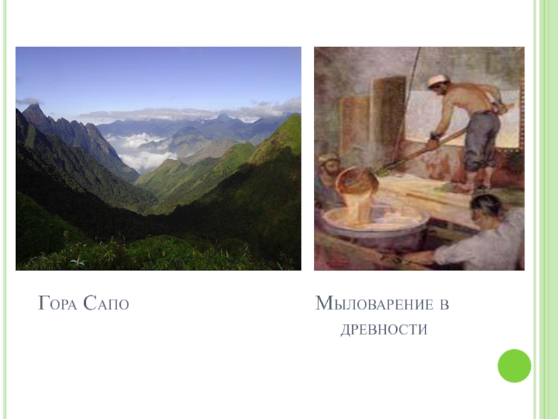 По одной из легенд слово soap (мыло) произошло от названия горы Сапо в древнем Риме, где происходило принесение жертв богам. Смесь из растопленного животного жира и древесной золы жертвенного костра смывало дождем в глинистый грунт берега реки Тибр. Женщины, которые стирали там белье, обратили внимание, что благодаря этой смеси одежда отстирывается значительно легче. Так, постепенно стали использовать "дар богов" не только для стирки одежды, но и для мытья тела.