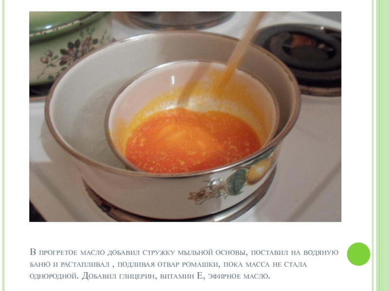 Слайд 14В прогретое масло добавил стружку мыльной основы, поставил на водяную баню
