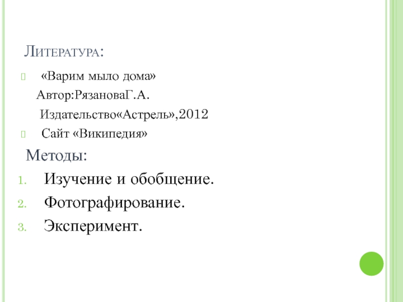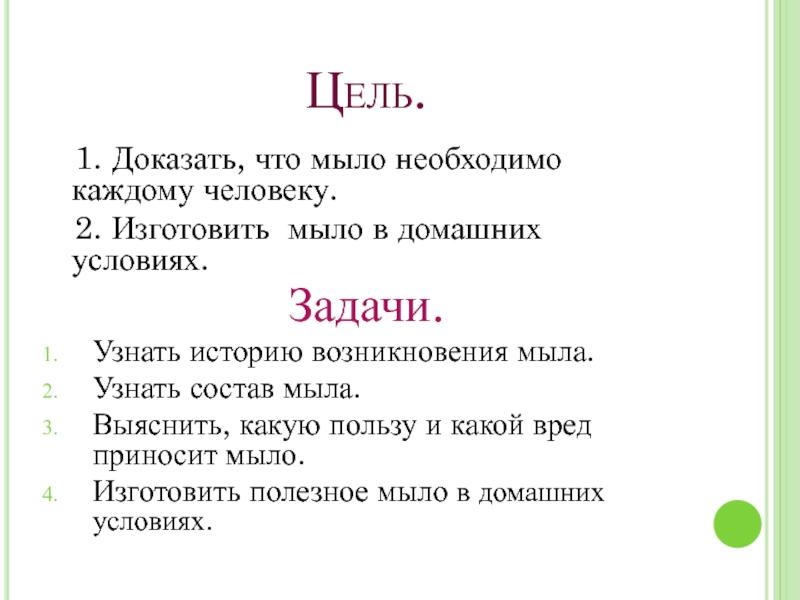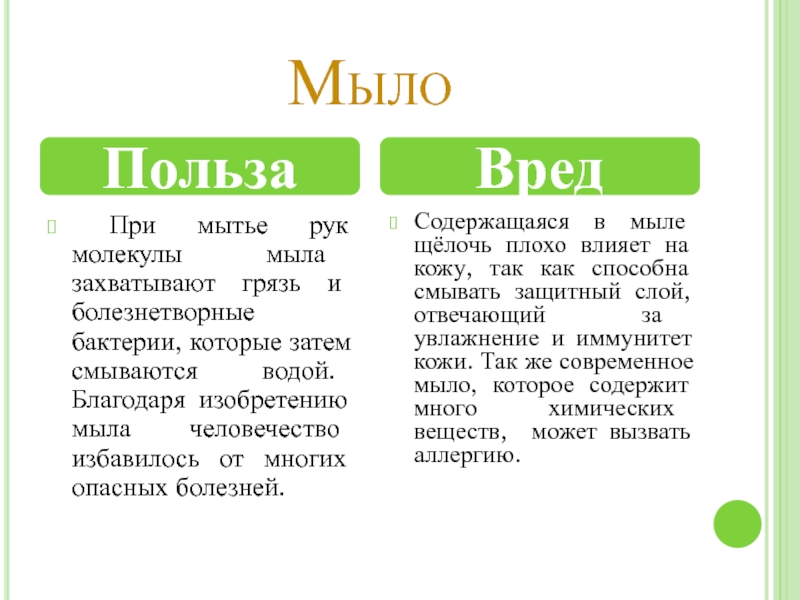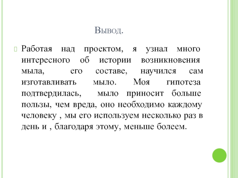 его составе, научился сам изготавливать мыло. Моя гипотеза подтвердилась, мыло приносит больше пользы, чем вреда, оно необходимо каждому человеку , мы его используем несколько раз в день и , благодаря этому, меньше болеем.