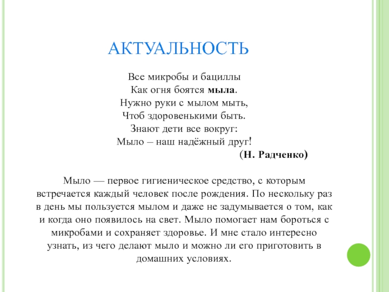 Мыло — первое гигиеническое средство, с которым встречается каждый человек после рождения. По нескольку раз в день мы пользуется мылом и даже не задумывается о том, как и когда оно появилось на свет. Мыло помогает нам бороться с микробами и сохраняет здоровье. И мне стало интересно узнать, из чего делают мыло и можно ли его приготовить в домашних условиях.