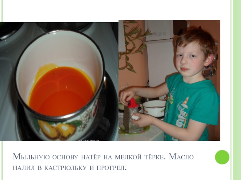 Слайд 13Мыльную основу натёр на мелкой тёрке. Масло налил в кастрюльку и