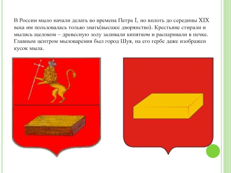до середины XIX века им пользовалась только знать(высшее дворянство). Крестьяне стирали и мылись щелоком – древесную золу заливали кипятком и распаривали в печке. Главным центром мыловарения был город Шуя, на его гербе даже изображен кусок мыла.
