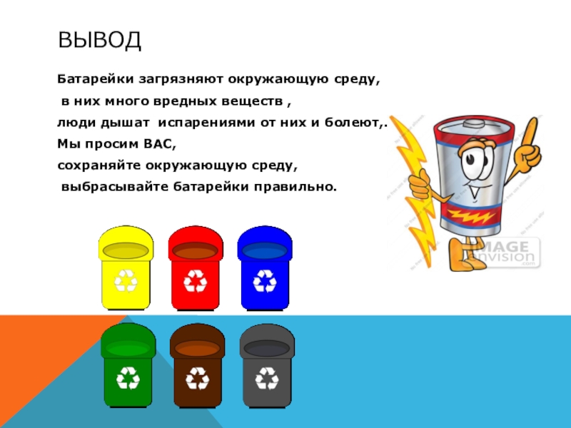 ВыводБатарейки загрязняют окружающую среду, в них много вредных веществ , люди дышат испарениями от них и болеют,.Мы