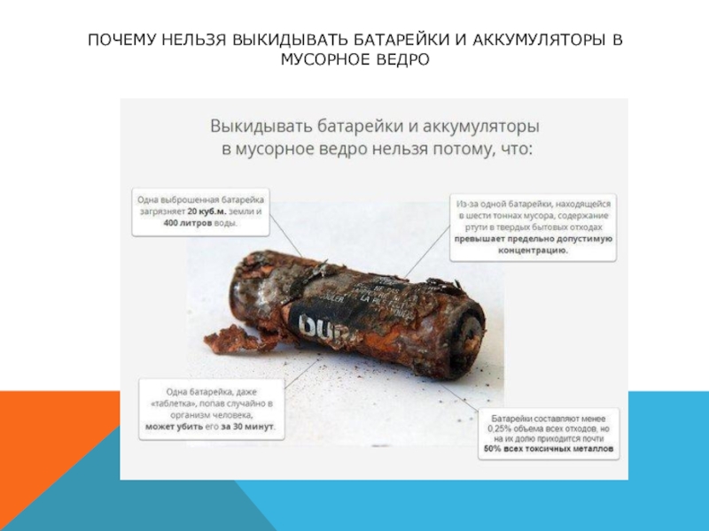 Слайд 4Почему нельзя выкидывать батарейки и аккумуляторы в мусорное ведро