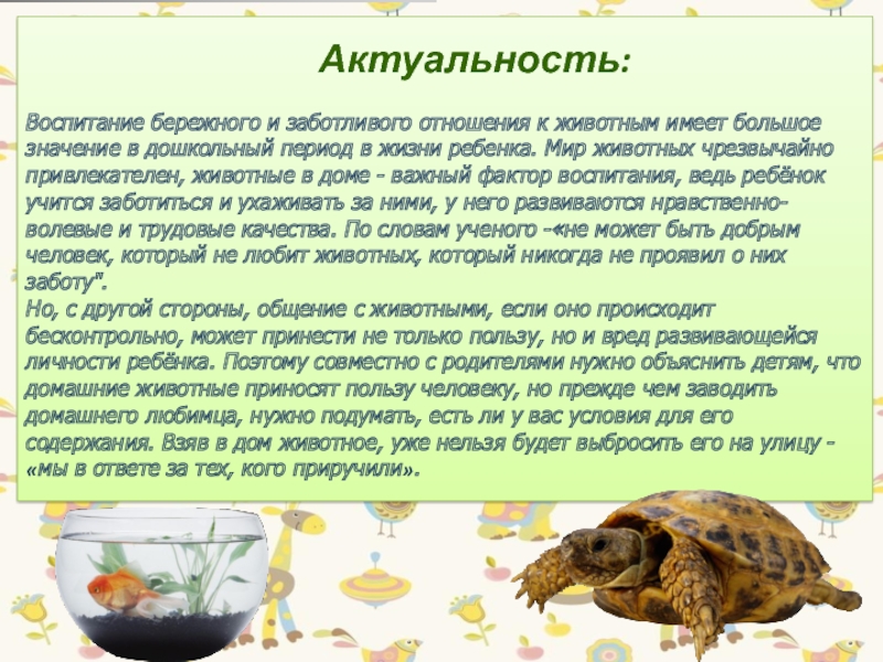 Воспитание бережного и заботливого отношения к животным имеет большое значение в дошкольный период в жизни ребенка. Мир животных чрезвычайно привлекателен, животные в доме - важный фактор воспитания, ведь ребёнок учится заботиться и ухаживать за ними, у него развиваются нравственно-волевые и трудовые качества. По словам ученого -«не может быть добрым человек, который не любит животных, который никогда не проявил о них заботу".