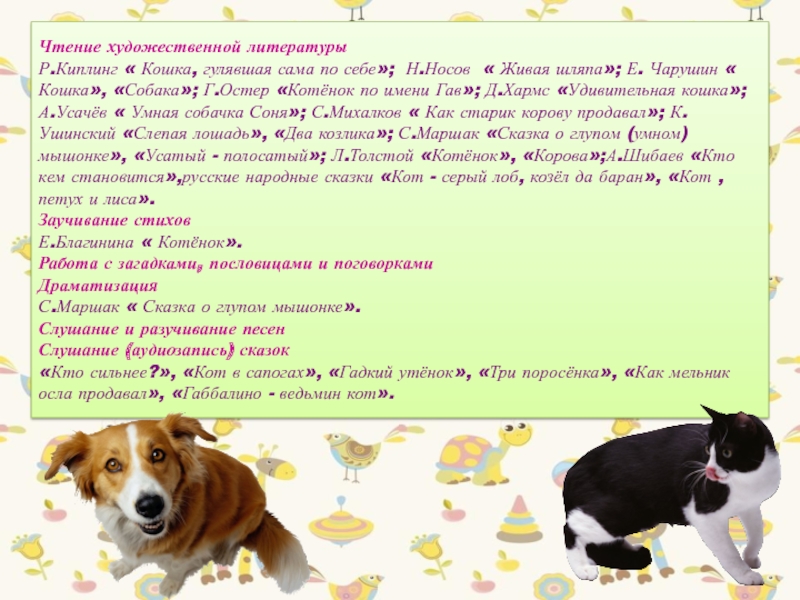 Живая шляпа»; Е. Чарушин « Кошка», «Собака»; Г.Остер «Котёнок по имени Гав»; Д.Хармс «Удивительная кошка»; А.Усачёв « Умная собачка Соня»; С.Михалков « Как старик корову продавал»; К.Ушинский «Слепая лошадь», «Два козлика»; С.Маршак «Сказка о глупом (умном) мышонке», «Усатый - полосатый»; Л.Толстой «Котёнок», «Корова»;А.Шибаев «Кто кем становится»,русские народные сказки «Кот - серый лоб, козёл да баран», «Кот , петух и лиса».