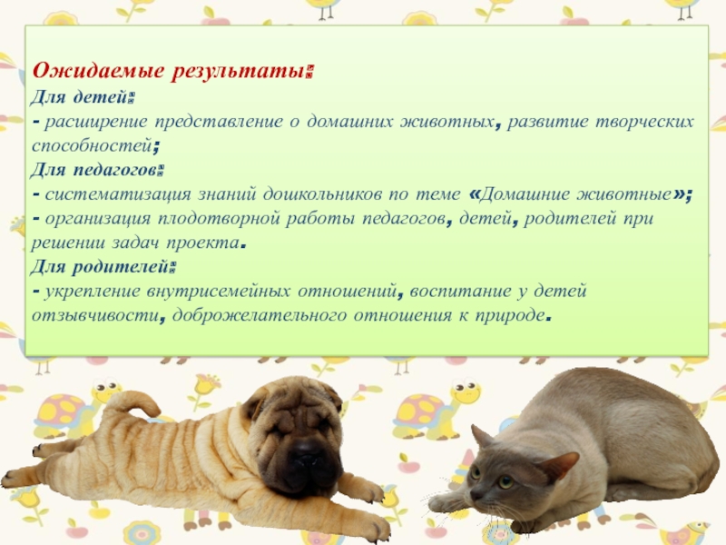 - получить более обширное представление о разнообразии домашних питомцев, о способах ухода за ними, о правилах безопасного поведения при общении с животными;