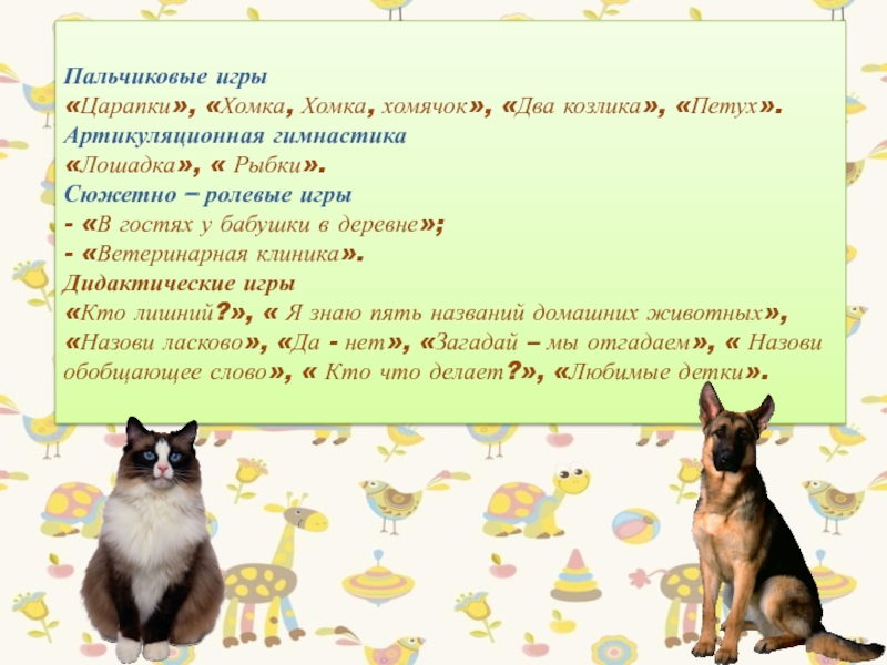 «Кто лишний?», « Я знаю пять названий домашних животных», «Назови ласково», «Да - нет», «Загадай – мы отгадаем», « Назови обобщающее слово», « Кто что делает?», «Любимые детки».