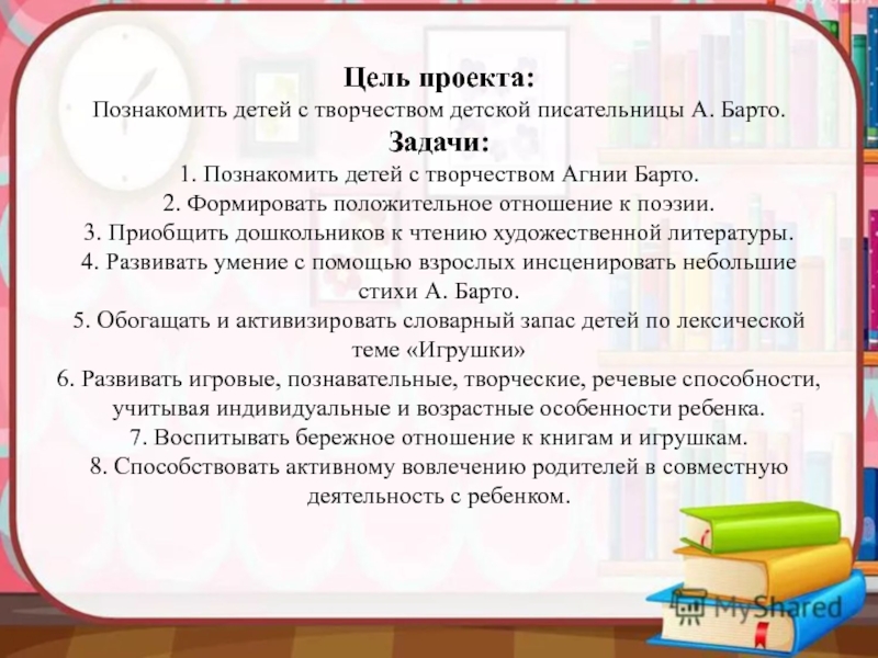 Цель проекта: Познакомить детей с творчеством детской писательницы А. Барто. Задачи: 1. Познакомить детей с творчеством Агнии Барто. 2. Формировать положительное отношение к поэзии. 3. Приобщить дошкольников к чтению художественной литературы. 4. Развивать умение