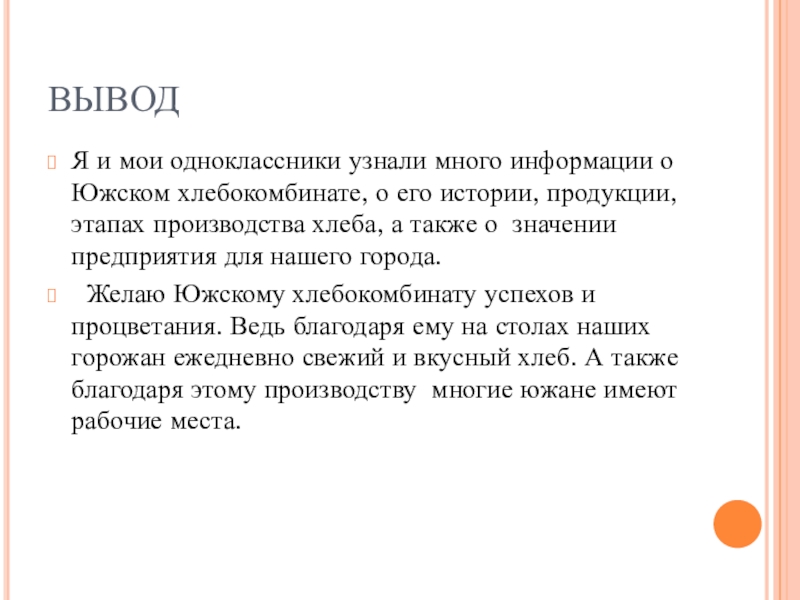 выводЯ и мои одноклассники узнали много информации о Южском хлебокомбинате, о его истории, продукции, этапах производства хлеба,