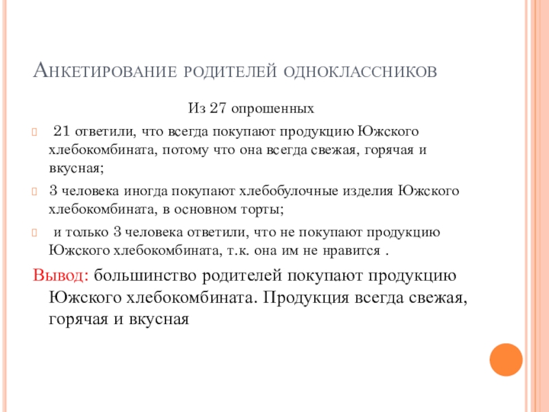 Анкетирование родителей одноклассниковИз 27 опрошенных 21 ответили, что всегда покупают продукцию Южского хлебокомбината, потому что она всегда
